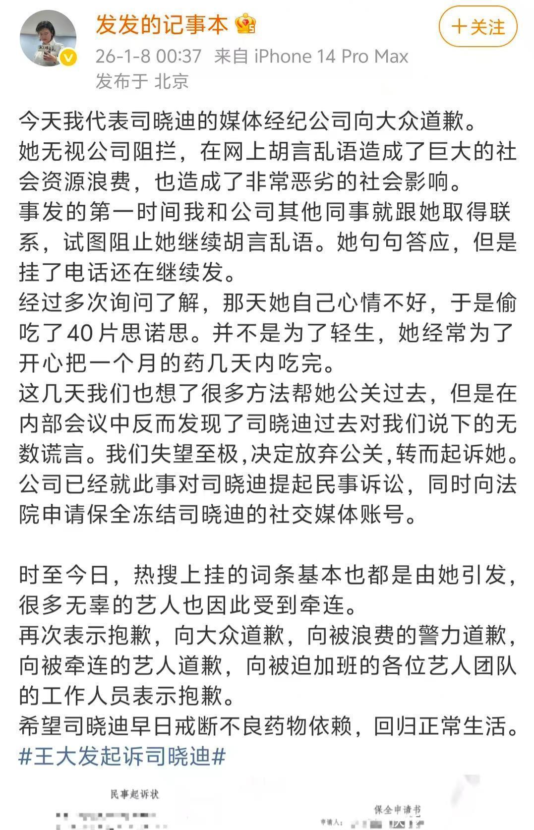 2026开年第一大瓜,也就是司晓迪事件,不仅没完,而且越来越抓马。爆料十多位男星后,没想到司晓迪没等到明星们的律师函,却被自己的老板王大发起诉了。看到这个新闻,笔者一方面惊讶于原来王大发是司晓迪的老板,难怪呢!另一方面,不得不感叹这反转,够大,够刺激。